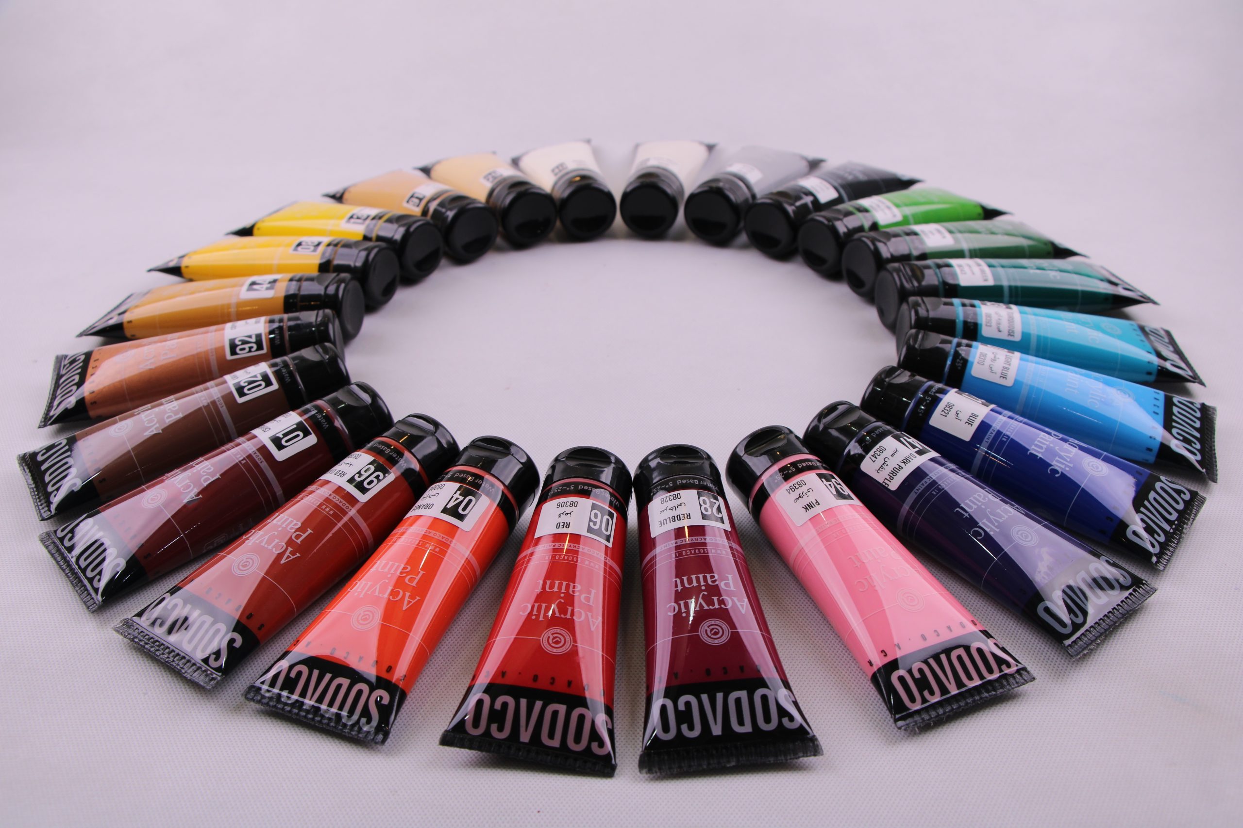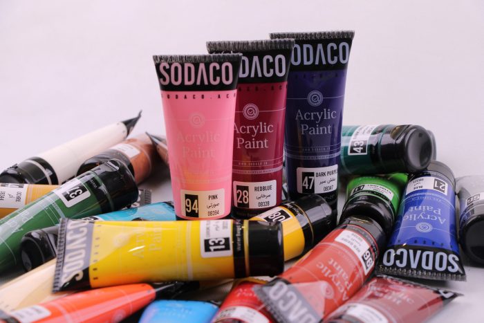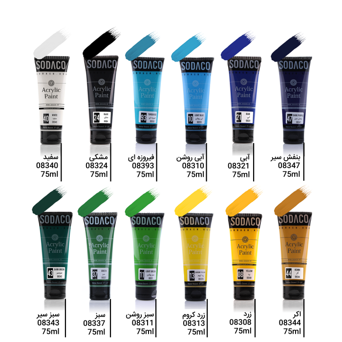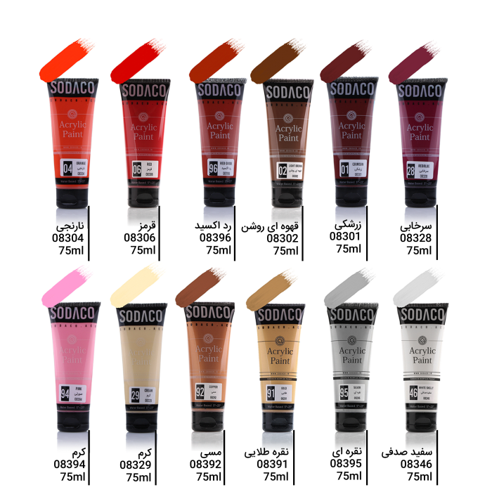 رنگهای اکریلیک تیوپی در انواع ساده و متالیک در 25 رنگ سفید، کرم، زرد، زرد کروم، اکر، قرمز، آبی روشن، آبی، فیروزه ای، بنفش سیر، زرشکی، سرخابی، صورتی، نارنجی، سبز، سبز روشن، سبز سیر، رداکسید، قهوه ای، قهوهای روشن، مشکی، متالیک طلایی، متالیک نقرهای، متالیک مسی و متالیک صدفی عرضه میشود.